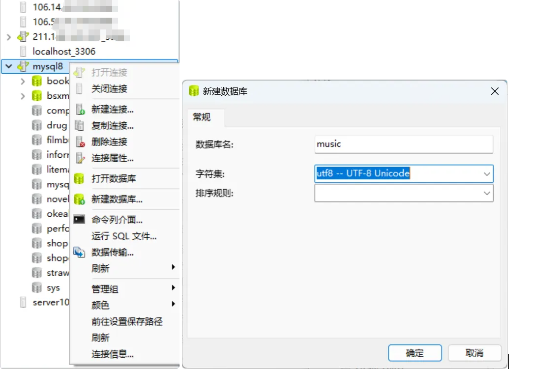 打开 navicat ,在链接上单击右键 “新建数据库”,在弹框中输入“数据库名”例如:“music” (这里是我自己起的名字 )