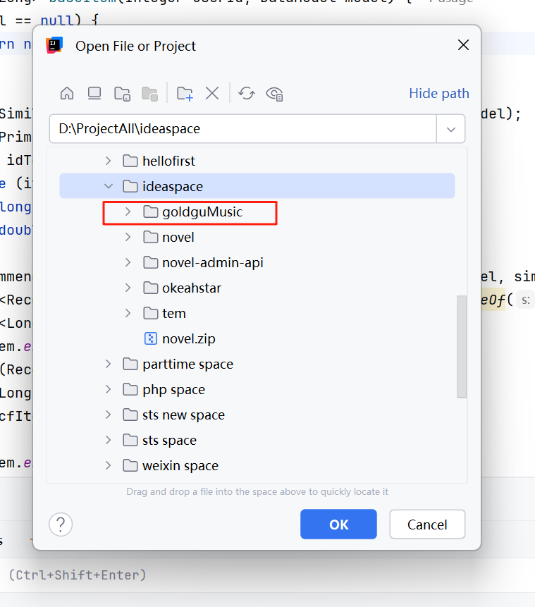 在弹框中找到具体的项目路径,选中后点击“ok”后即可打开项目。