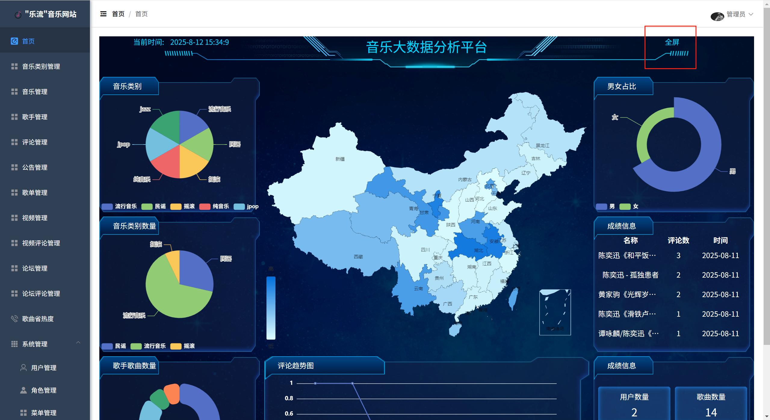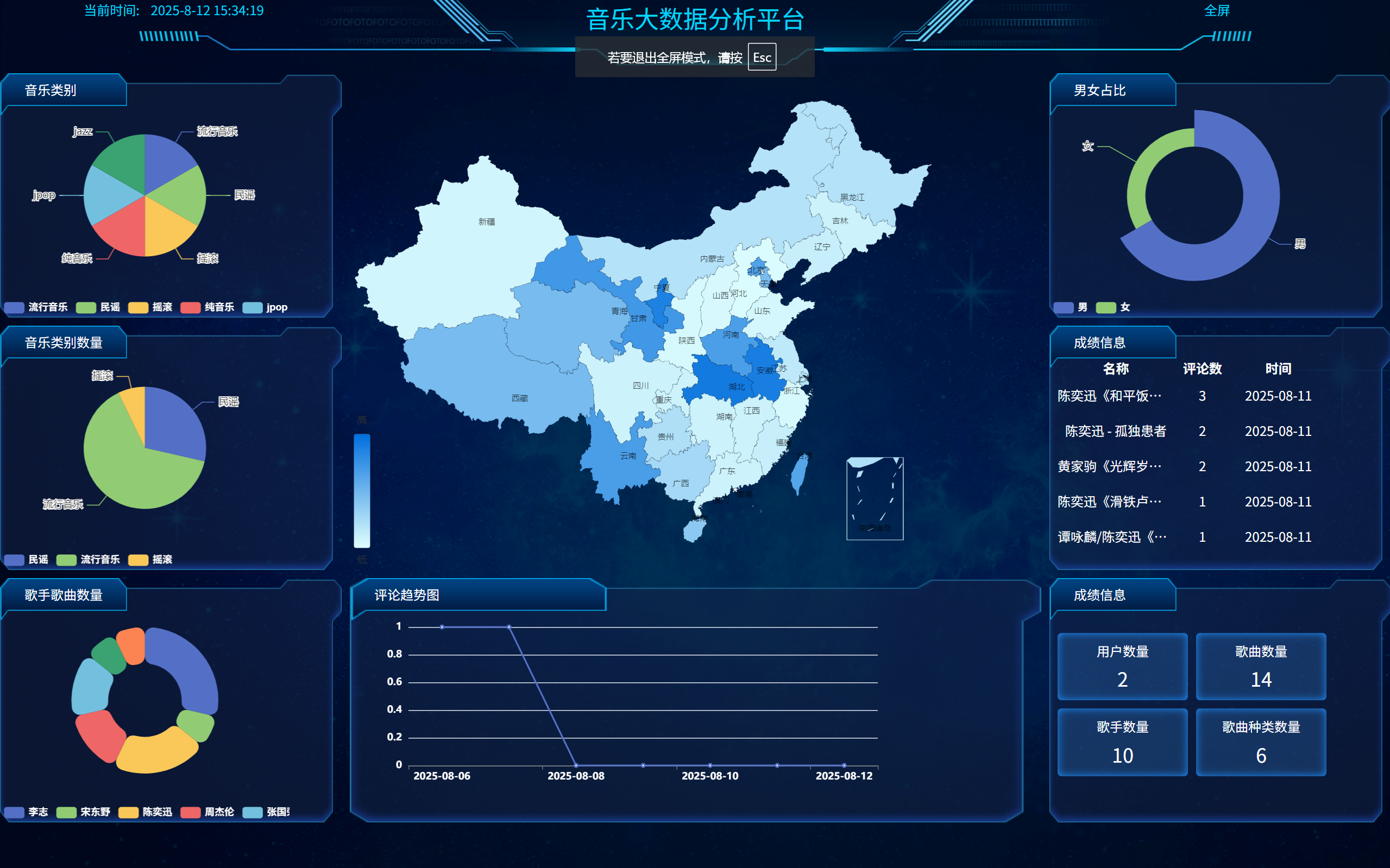 登陆后进来的首页大屏展示的是整个系统的数据分析汇总的情况概览。包括音乐类别数量,男女占比,歌手数量类型,评论趋势等数据
